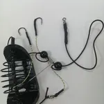 Монтаж изготовлен на ультропрочном шнуре маскировочного цвета. Оснащен двумя крючка номер 8. Скользящая кормушка хорошо держится на течении и ложится всегда на дно грузом вниз. Номер крючка и вес кормушки разные.